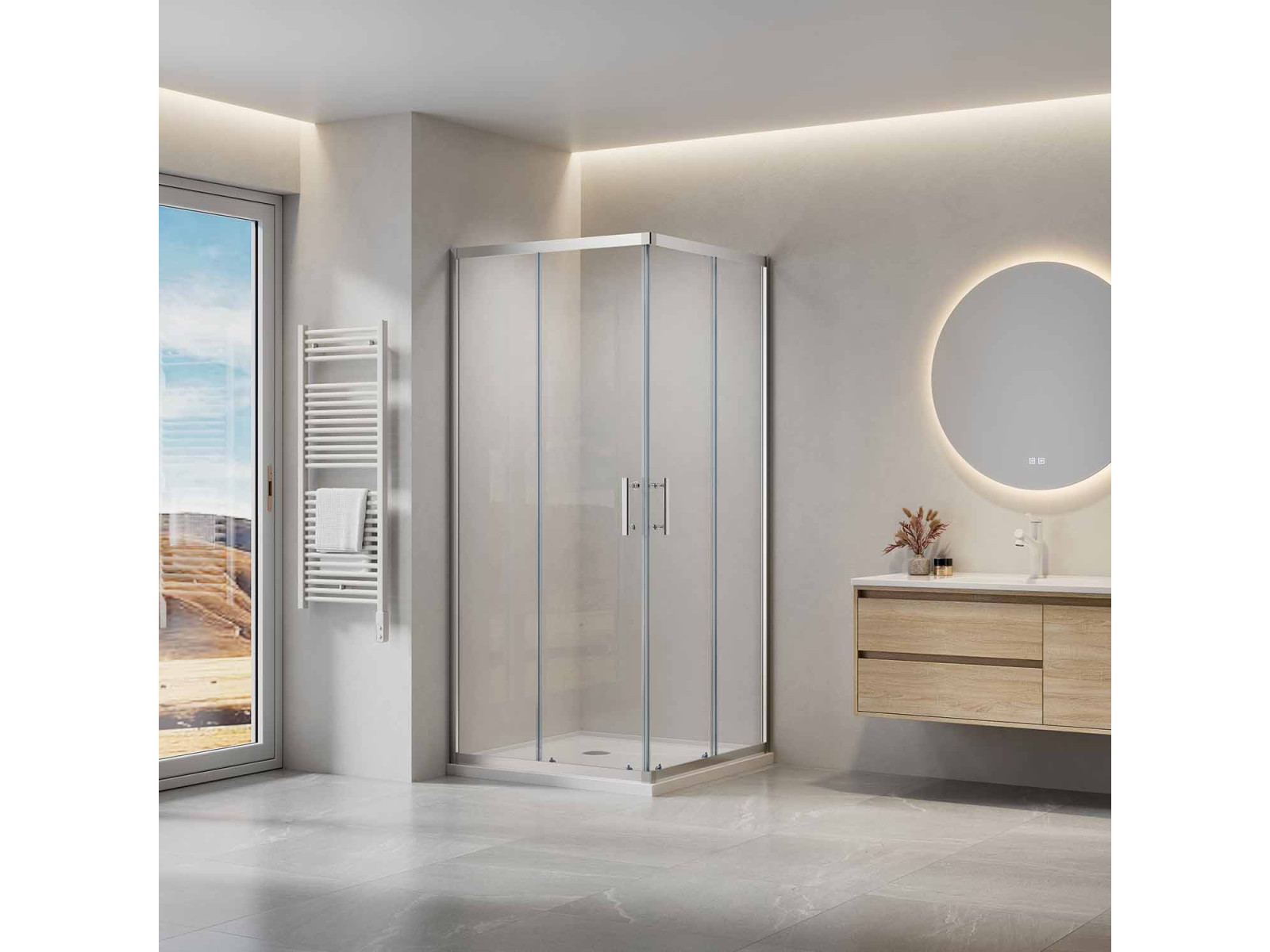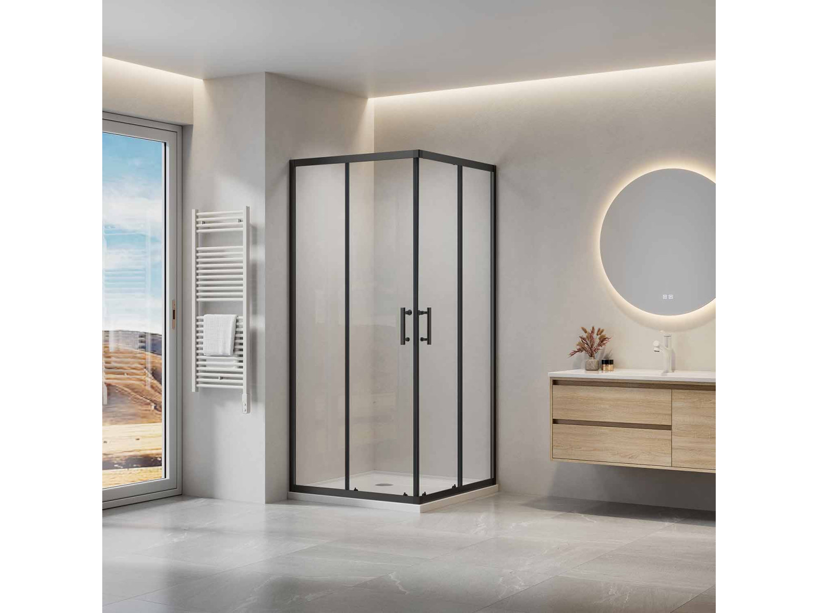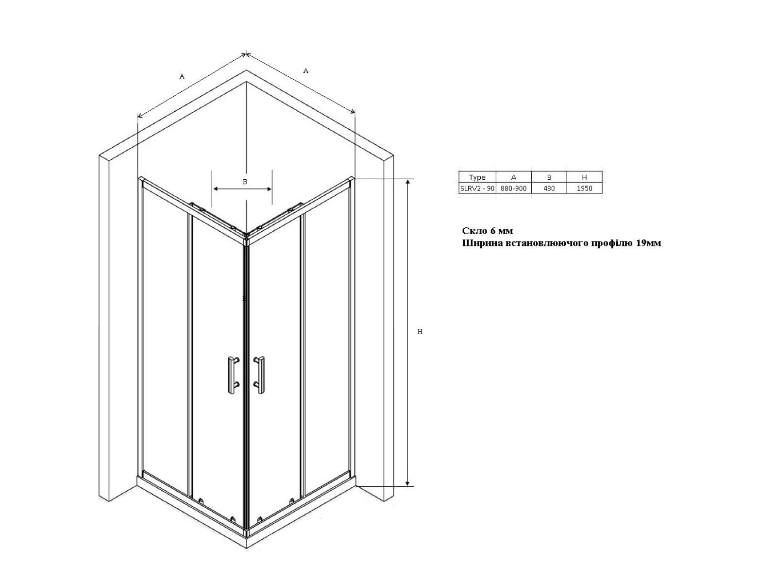 Душовий куточок прямокутний розсувний, чотирьох елементний SLRV2. У розмірі: 90х90см; Висота виробу: 1950 мм. Колір профілю: чорний матовий; Комплектація: ручки ABS, подвійні чорні регульовані верхні ролики та подвійні нижні ролики з регульованою пружиною; Вітраж із безпечного скла: 6 мм. прозорий (TRANSPARENT) з захисним покриттям AntiCalc; Гарантія: 5 років. Виріб складається з двох рівних нерухомих частин і двох рівних рухомих частин, що утворюють розсувні двері. Встановлюється в облицьований кахлями кут ванної кімнати на піддони RAVAK ANGELA, PERSEUS, PERSEUS PRO, PERSEUS PRO FLAT, PERSEUS PRO CHROME, GIGANT PRO, GIGANT PRO FLAT, GIGANT PRO CHROME або безпосередньо на підлогу з вбудованим душовим каналом або трапом.Parametry